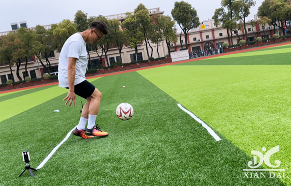 黃康在操場上訓(xùn)練足球科目。
