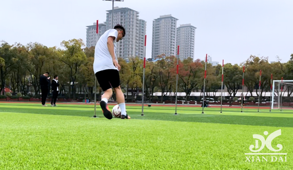 黃康在操場訓(xùn)練足球科目。
