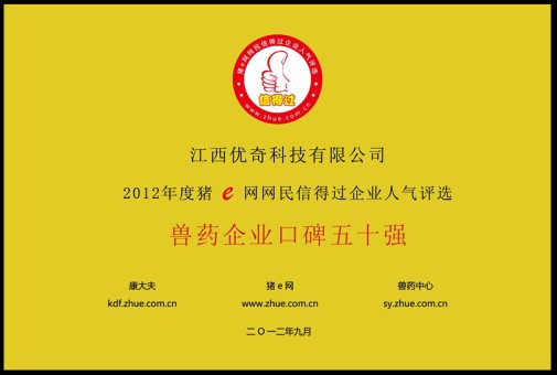 近日,由中國豬e網(wǎng)舉辦的“中國信得過獸藥企業(yè)人氣評選活動”順利落幕,在網(wǎng)友投票下,江西優(yōu)奇(動保)科技有限公司票數(shù)位列前茅,經(jīng)投票最后優(yōu)奇(動保)科技榮獲“2012年度信得過獸藥企業(yè)50強(qiáng)”。