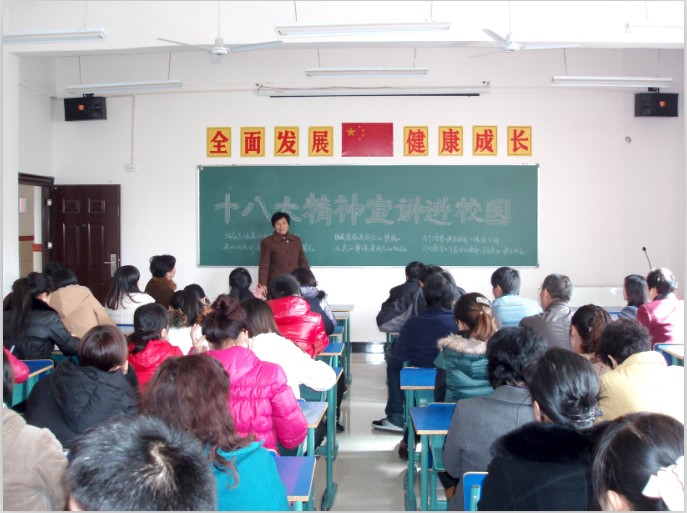 宣講會(huì)過(guò)程中,李金玉圍繞黨的十八大報(bào)告精神,結(jié)合學(xué)校的工作實(shí)際,提出了今后學(xué)校發(fā)展的一系列計(jì)劃和措施:大力推進(jìn)依法治校,進(jìn)一步落實(shí)立德樹人的根本任務(wù);加強(qiáng)和改進(jìn)中小學(xué)德育工作,繼續(xù)組織開展中小學(xué)弘揚(yáng)和培育民族精神教育活動(dòng);深入實(shí)施素質(zhì)教育,推動(dòng)學(xué)校中華經(jīng)典誦讀、體育、藝術(shù)、衛(wèi)生與健康教育工作穩(wěn)步發(fā)展;加強(qiáng)教師隊(duì)伍建設(shè),提升教師專業(yè)化水平,抓好“青藍(lán)工程隊(duì)伍”建設(shè),進(jìn)一步提高教育質(zhì)量;維護(hù)學(xué)校安全與穩(wěn)定,加強(qiáng)學(xué)生安全教育,做好校園安全防范工作,做好學(xué)校傳染病防控工作,建設(shè)安全校園。李金玉要求,從現(xiàn)在開始,全校教師要切實(shí)增強(qiáng)貫徹落實(shí)十八大精神的自覺性和堅(jiān)定性;要立足教育教學(xué)崗位實(shí)際,解放思想,實(shí)事求是,與時(shí)俱進(jìn),開創(chuàng)進(jìn)取;要切實(shí)履行好工作職責(zé),站在民族復(fù)興的歷史新方位,迎接前所未有的復(fù)興曙光。教育工作者必須牢記使命,不忘責(zé)任,敢于擔(dān)當(dāng),為了培養(yǎng)建設(shè)祖國(guó)、保衛(wèi)祖國(guó)的棟梁之才,為早日實(shí)現(xiàn)中華民族偉大復(fù)興貢獻(xiàn)力量。